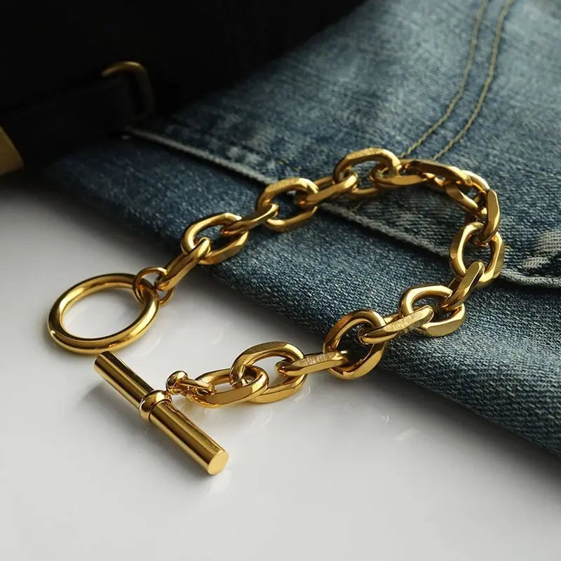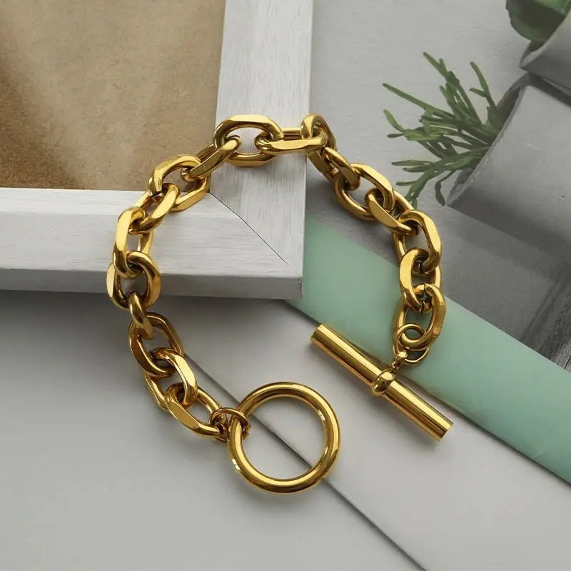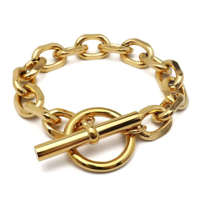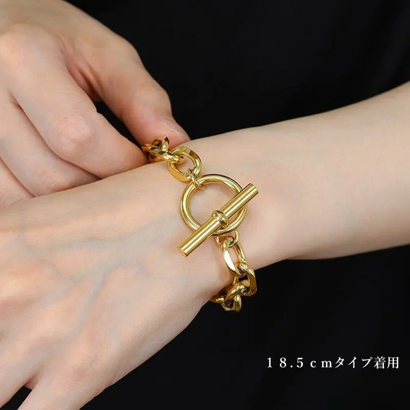 ごつめの小豆チェーンを採用したマンテルブレスレット。18KGPを施したゴールドカラーがとても美しい一品。シンプル、カジュアルなどのファッションに馴染みやすく、存在感を演出してくれます。