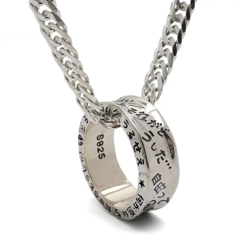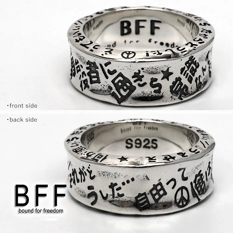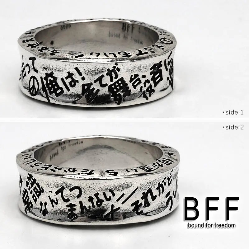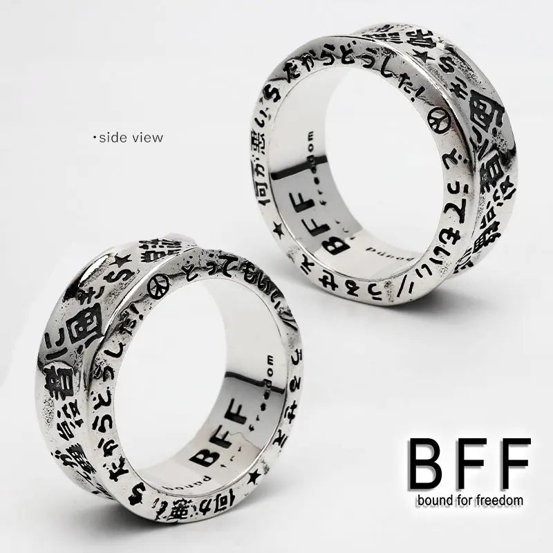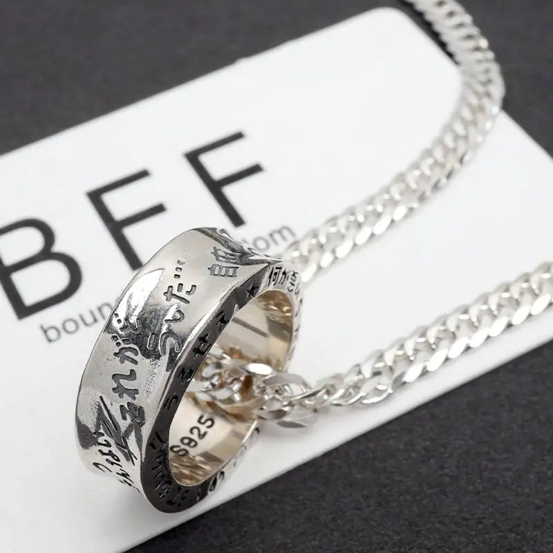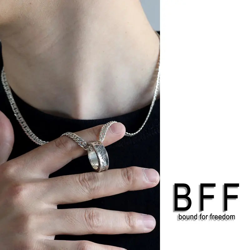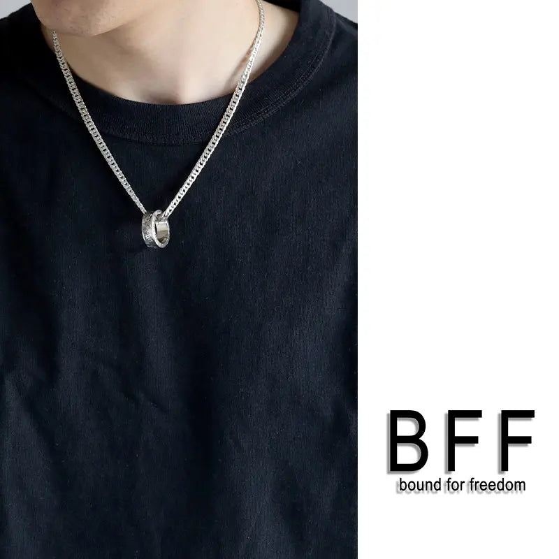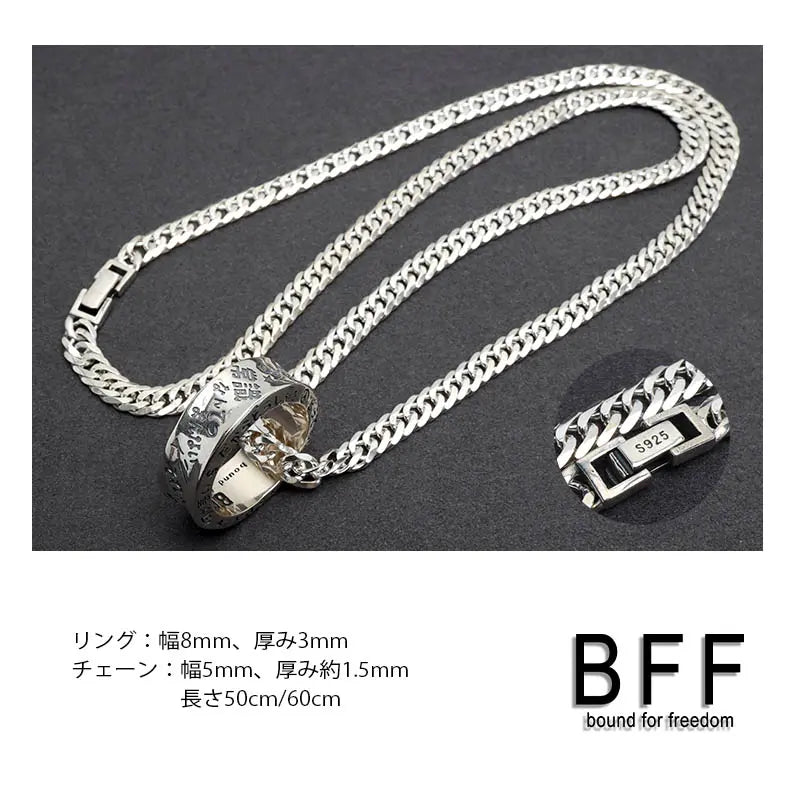 ”それがどうした" 重厚感溢れるシルバー925製のリングのボディにBFFを体現するワードをユニークに彫り込んだRAKUGAKIリングをペンダントに据えたネックレス。チェーンは重厚なダブル喜平チェーンをセット。