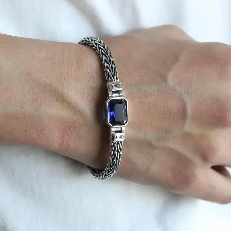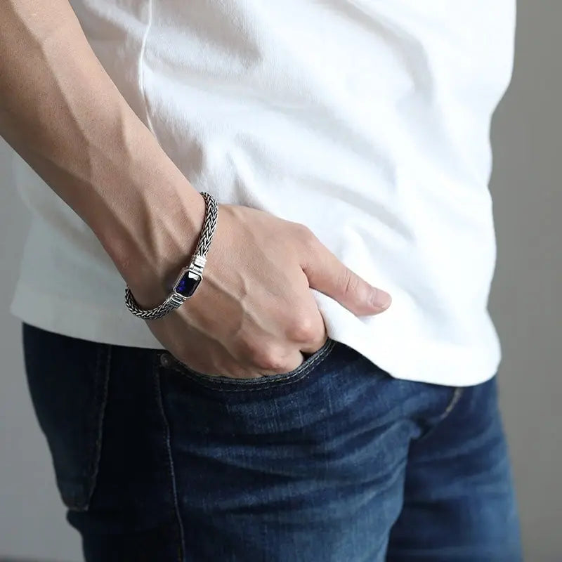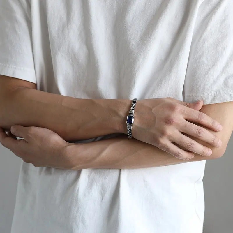 透明感たっぷりのブルーストーンを据えたシルバーブレスレット。密度の高いフランコチェーンが重厚感を演出。細部に刻まれた雷紋もポイント。