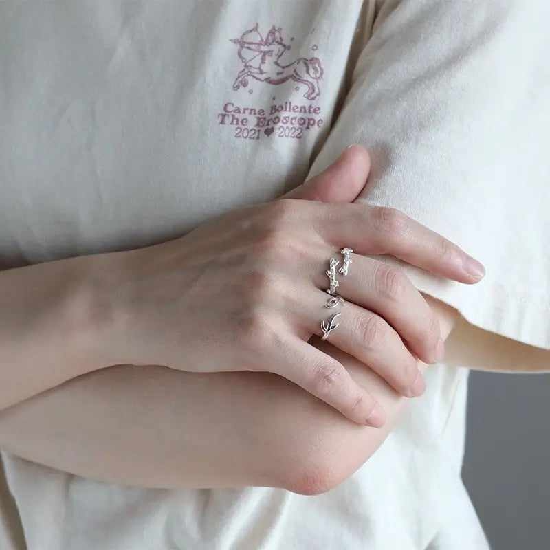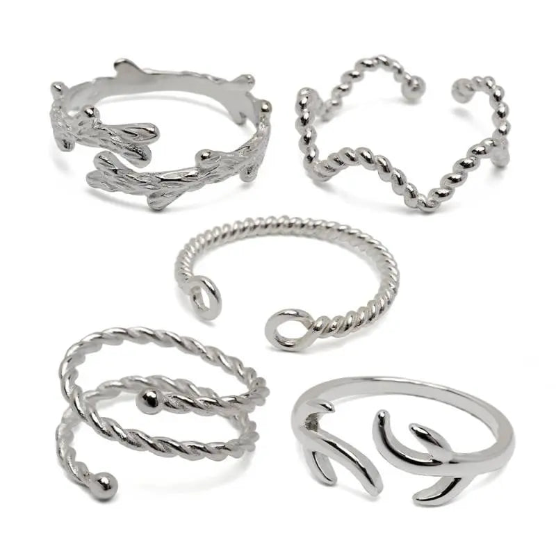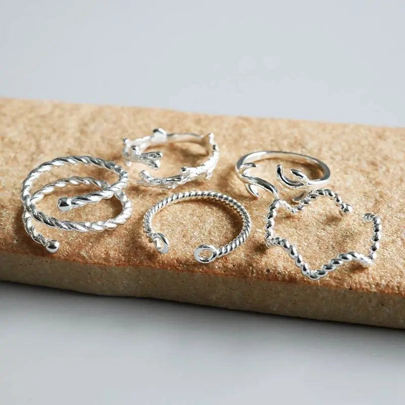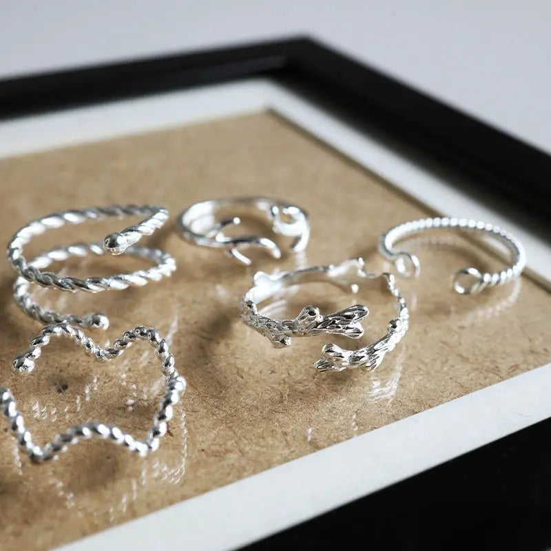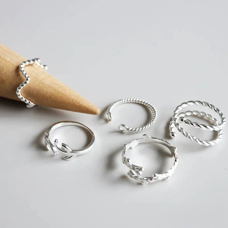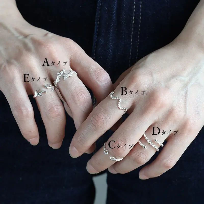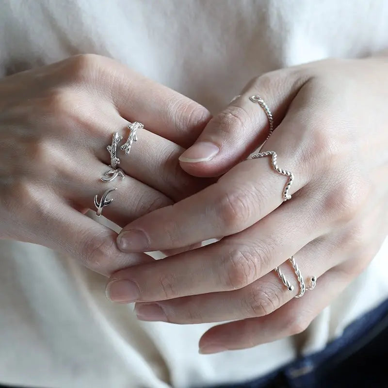 細身で洗練されたスタイルのシルバーリング。ツイストや葉っぱをモチーフにしたデザインなど、指先にさり気なく個性を宿します。デザイン違いの全5タイプのバリエーションから選べます。
