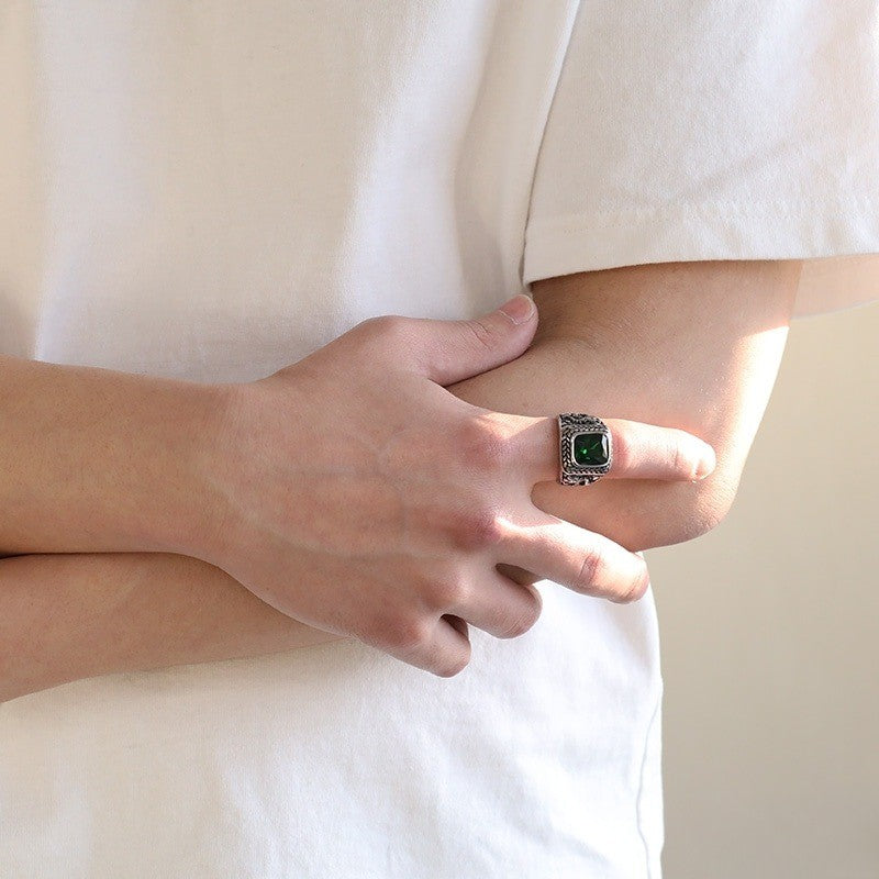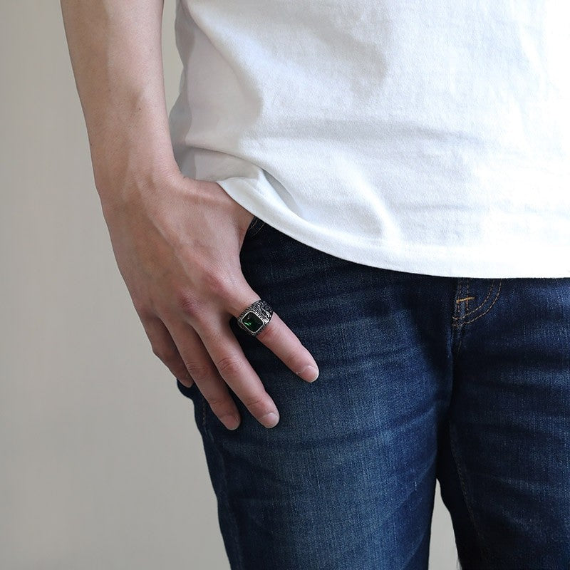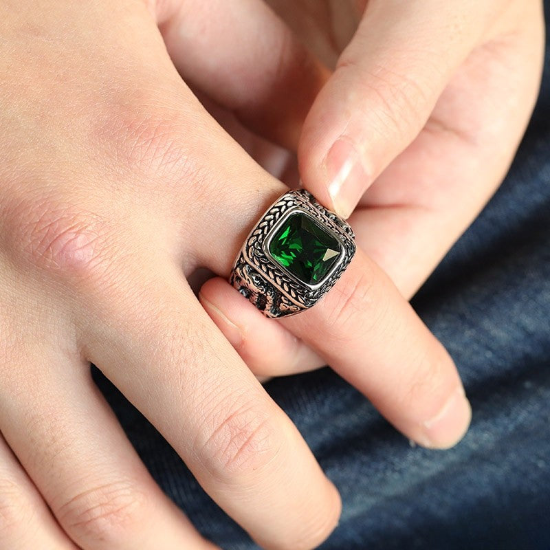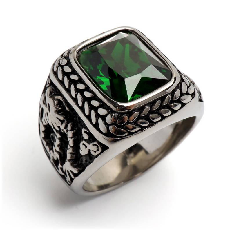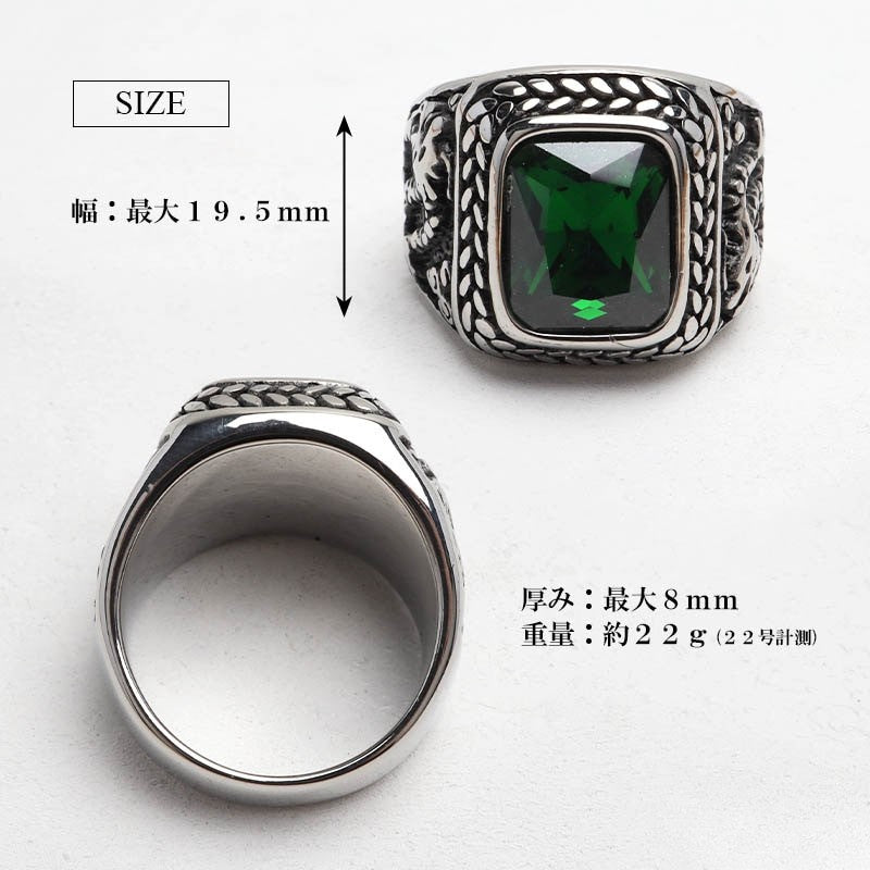 グリーンカラーをセットしたカレッジリング。サイドにはドラゴンが施され重厚感のある仕上がり。耐久性の高いステンレス素材。