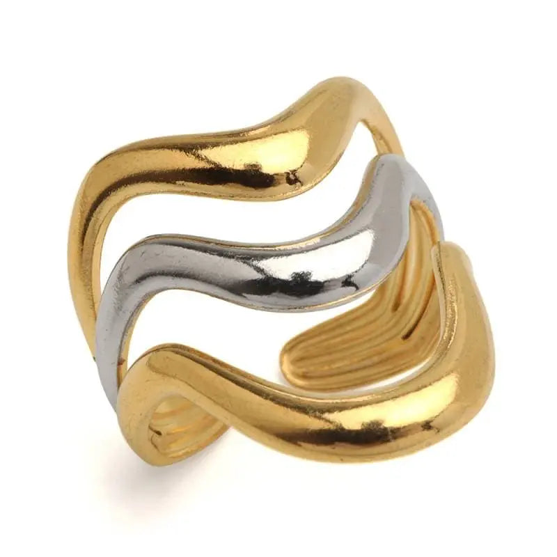 不規則に動く3本のラインが流動的なニュアンスリング。コンビカラーのこなれた印象と程よいごつめさが丁度良い。安心のステンレス製でつけっぱなしも大丈夫です。