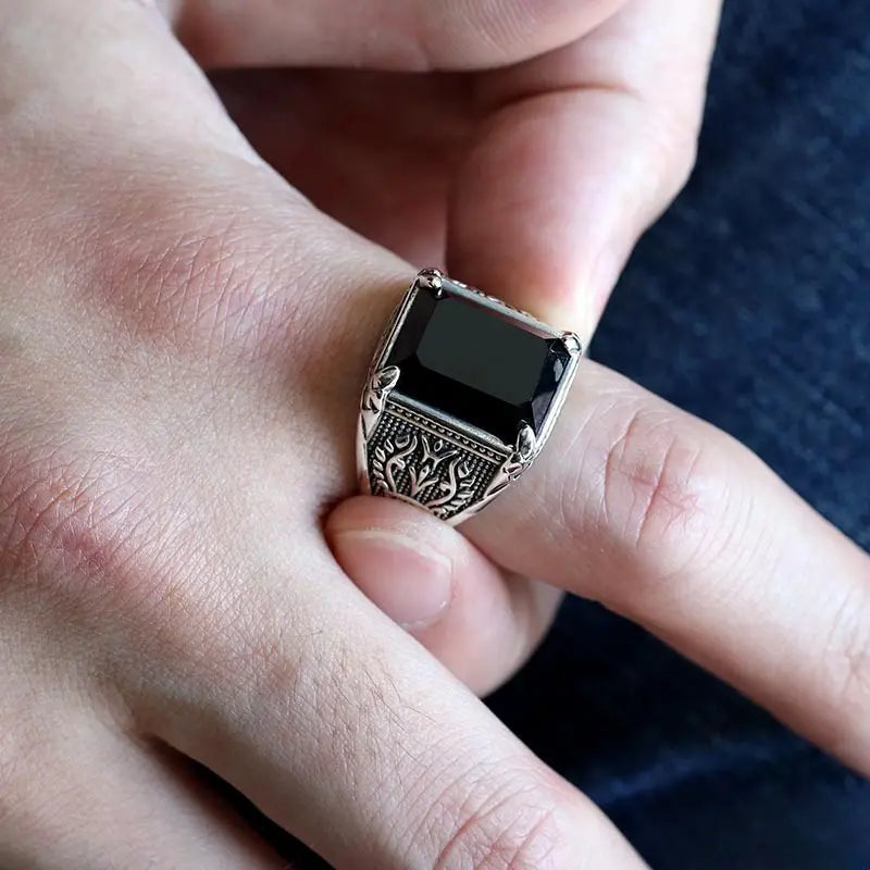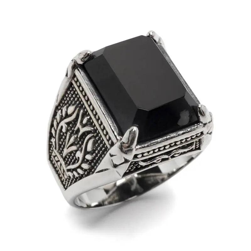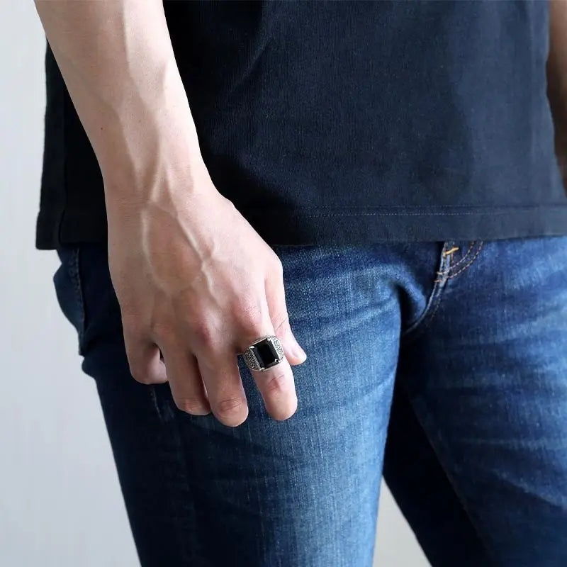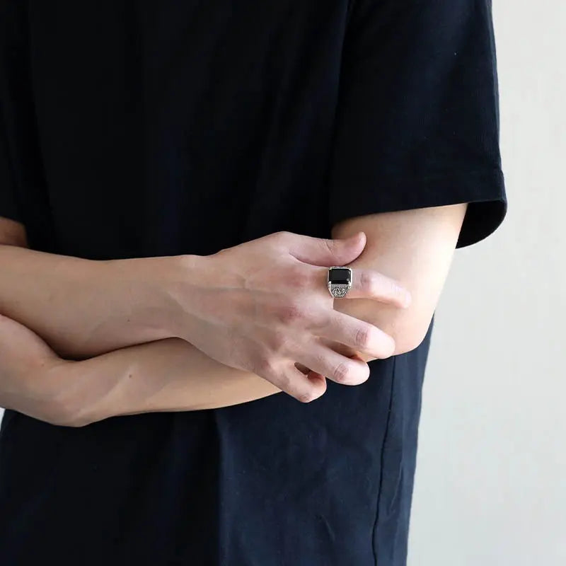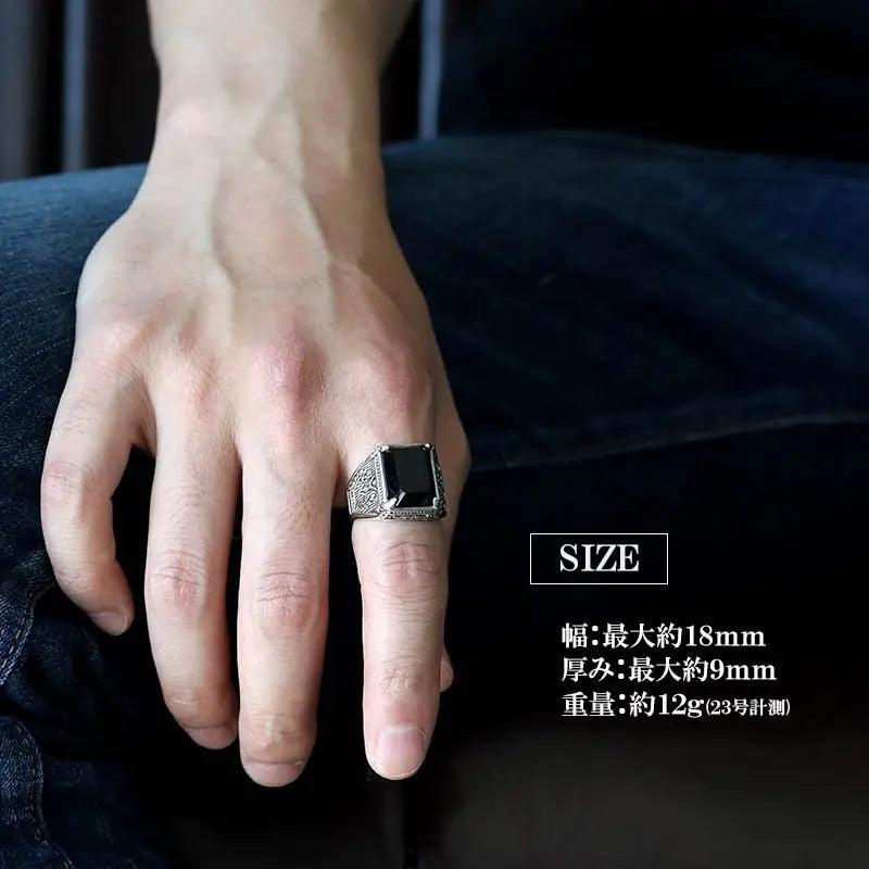 大粒のブラックストーンをセットしたワイドリング。サイドにはお洒落な紋章が繊細に刻まれています。一つ着けるだけで抜群の存在感を放ってくれます。