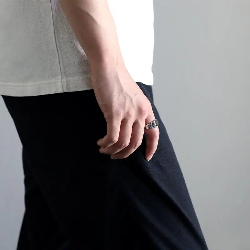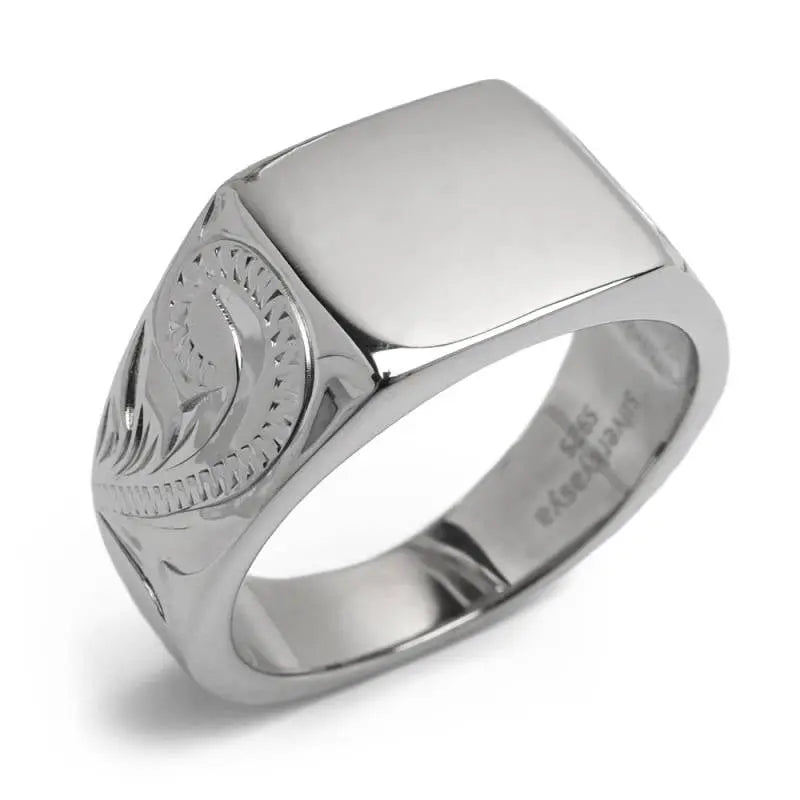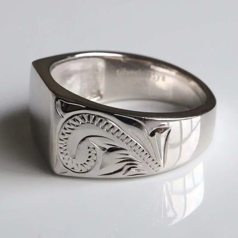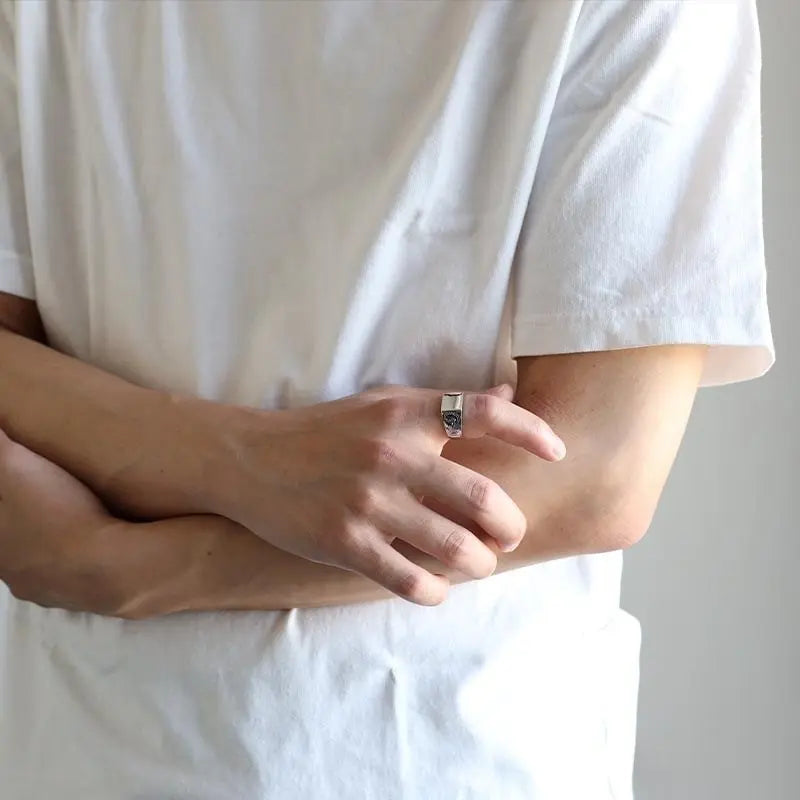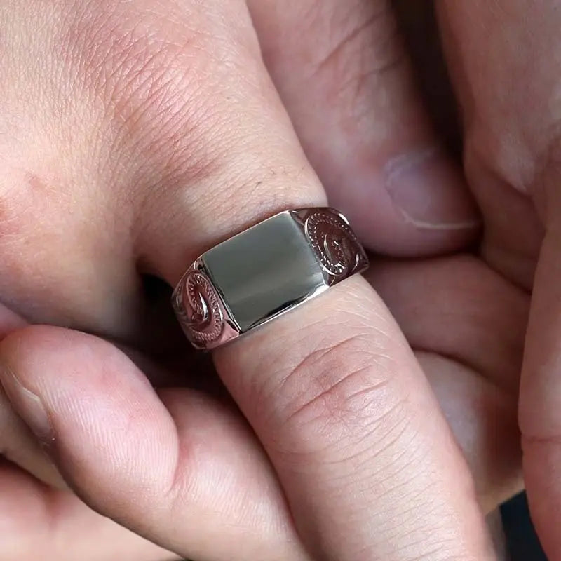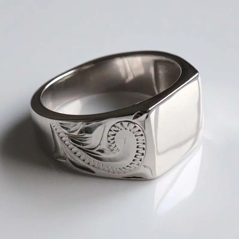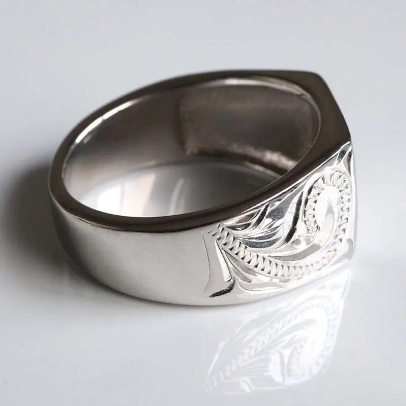 繊細に刻まれたハワイアン柄が映える印台リング。台座はスクエアでスタイリッシュな雰囲気を演出。広めの幅で存在感があり、シンプルな装いにアクセントとして発揮してくれます。