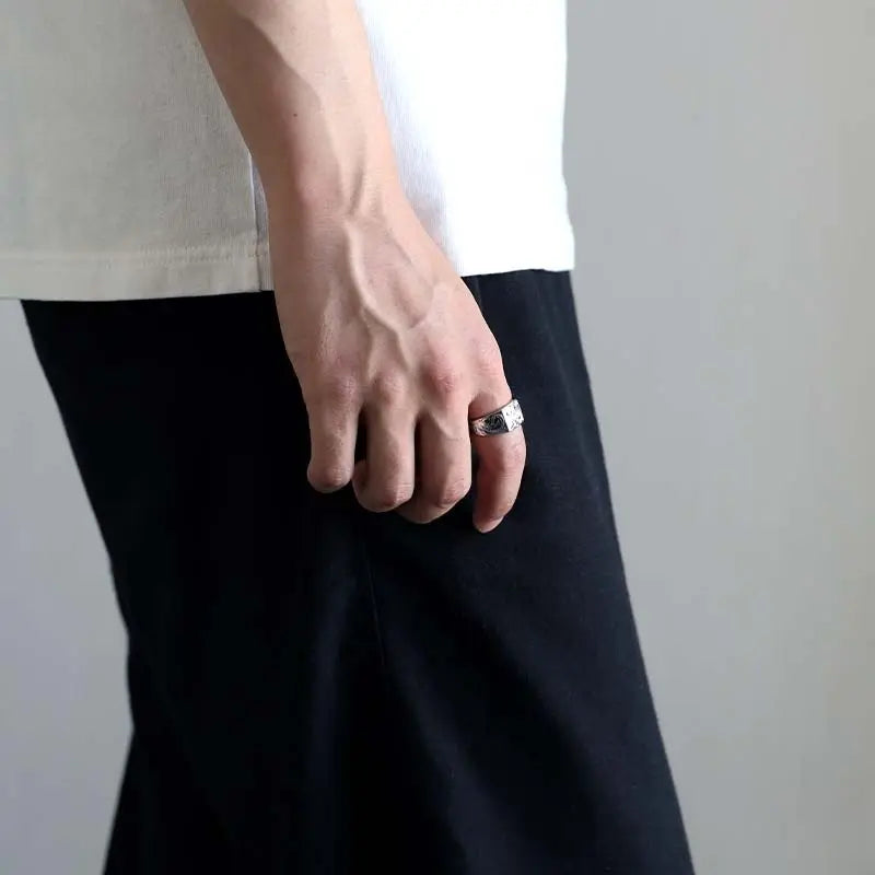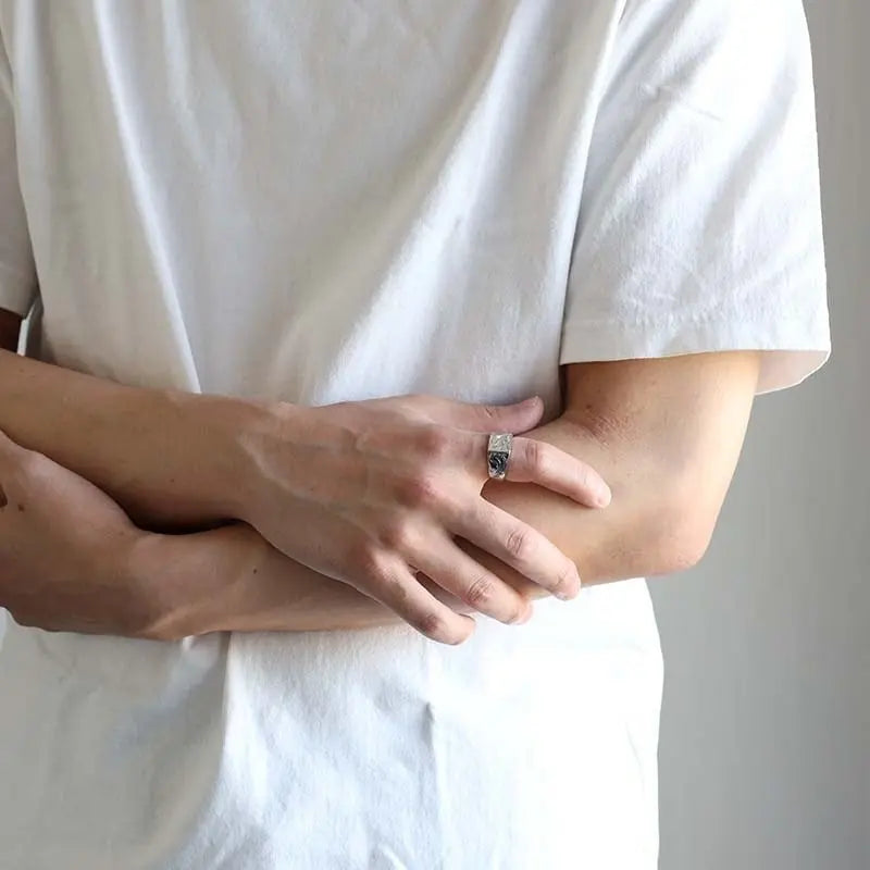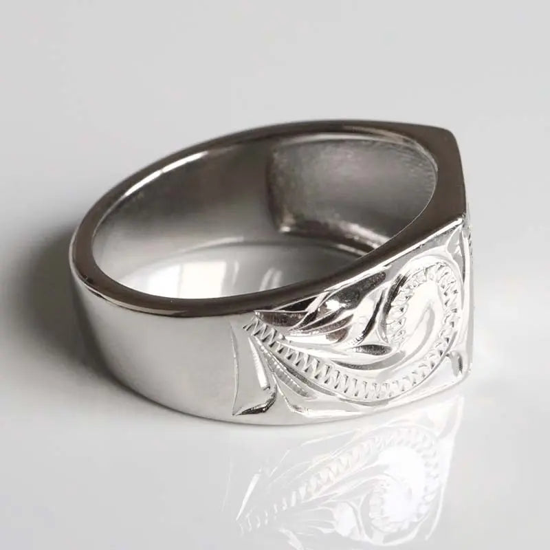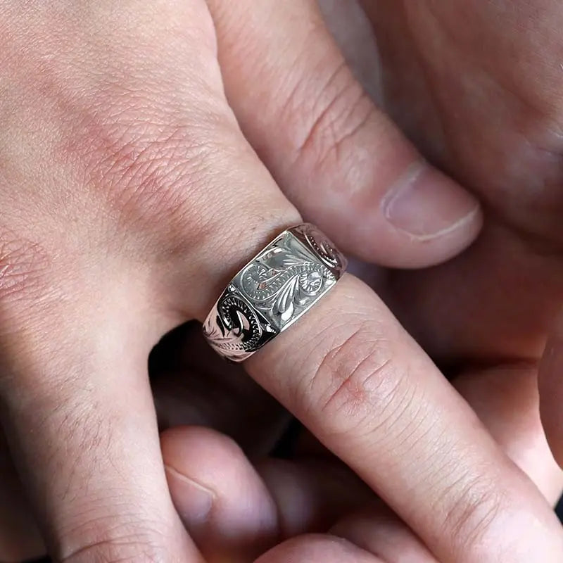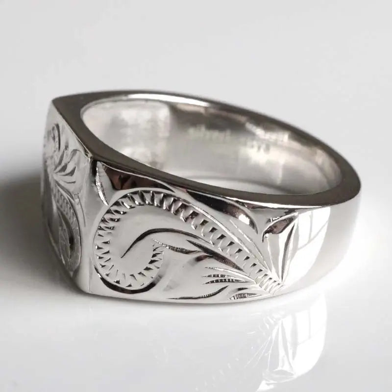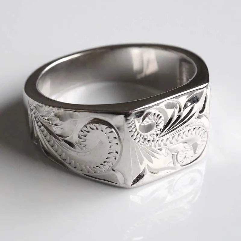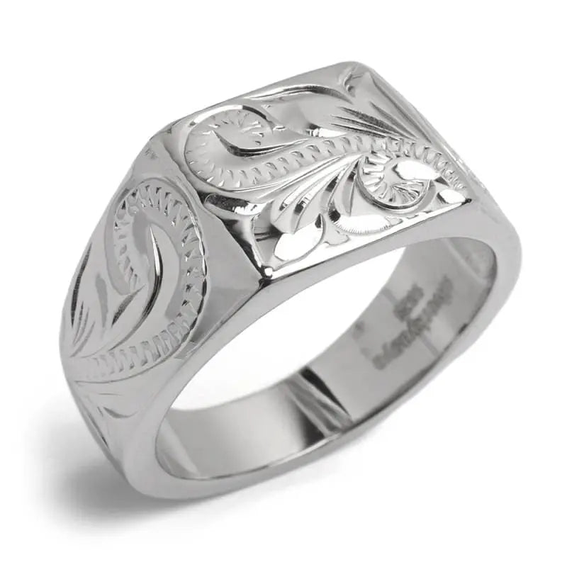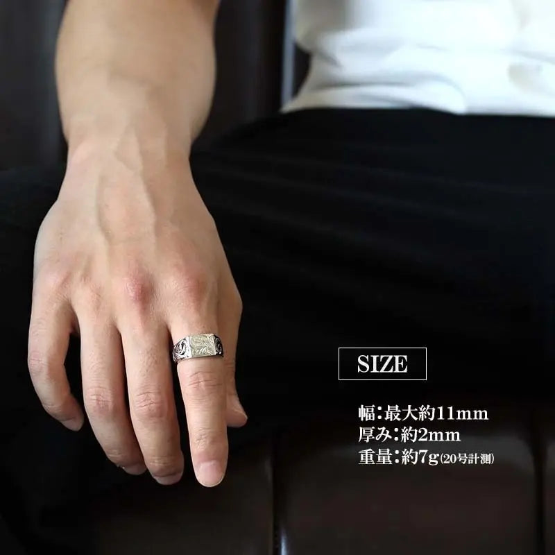 繊細に刻まれたハワイアン柄が映える印台リング。台座はスクエアでスタイリッシュな雰囲気を演出。広めの幅で存在感があり、シンプルな装いにアクセントとして発揮してくれます。