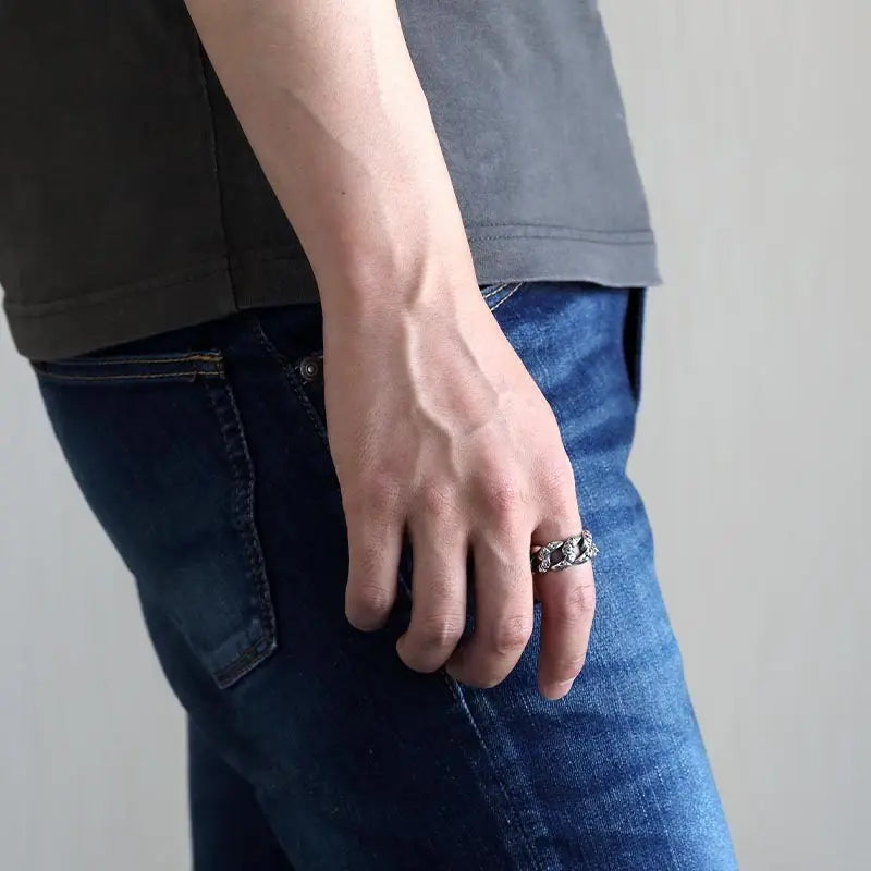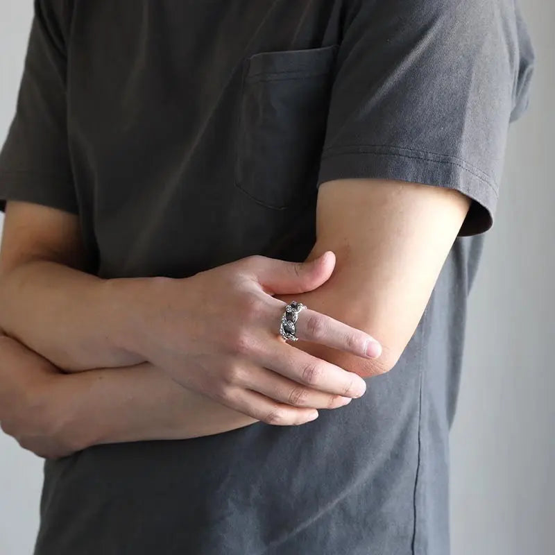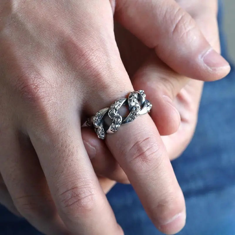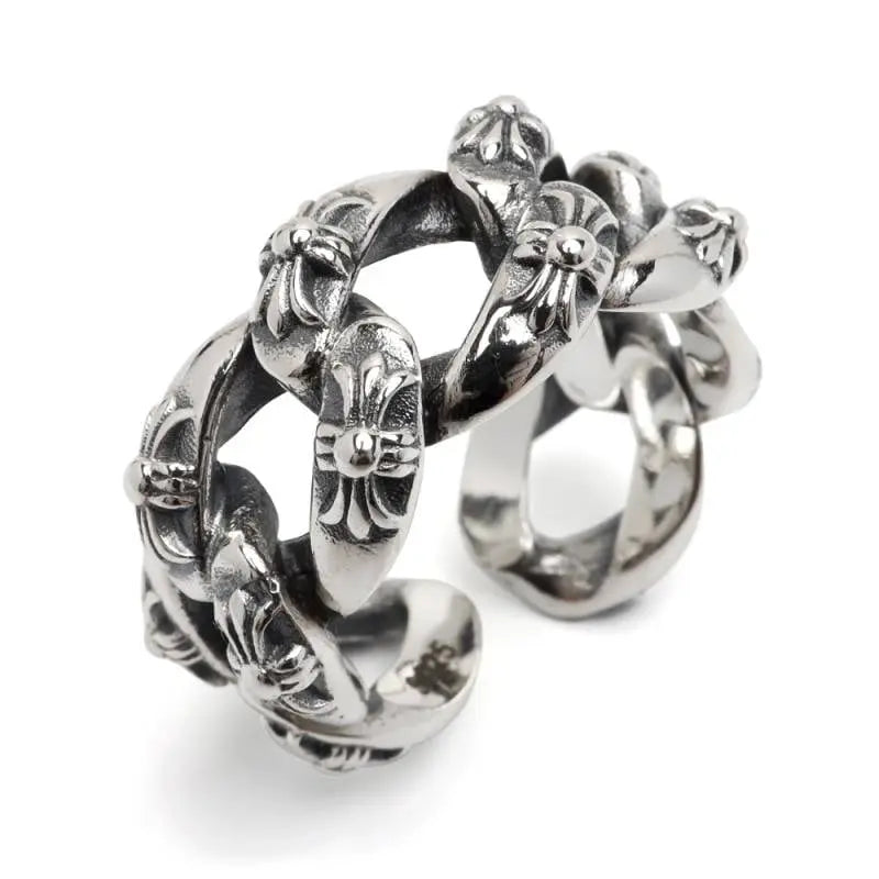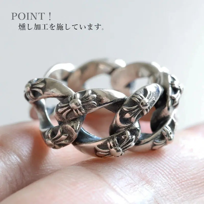 喜平チェーンの表面に複数のクロスをデザインしたごつめリング。燻し風加工を施しており、クロスが立体的な仕上がりに。単品使いでも十分に存在感を与えてくれます。